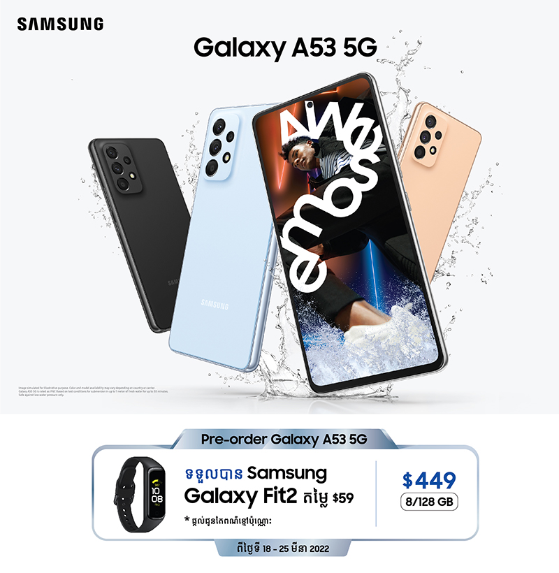 ជាក់ស្តែងថ្ងៃនេះ ដើម្បីឆ្លើយតបទៅនឹងតម្រូវការរបស់អតិថិជន និងដើម្បីឱ្យអតិថិជនទាំងអស់បានភ្លក់នូវរសជាតិតាមរសនិយមរបស់ខ្លួននៃបច្ចេកវិទ្យាជំនាន់ចុងក្រោយដ៏ច្រើនសម្បូរបែបរបស់ Galaxy A ស៊េរី ប្រចាំឆ្នាំ 2022 នេះ ក្រុមហ៊ុនបានបើកឱ្យអតិថិជនទាំងអស់ទូទាំងប្រទេសធ្វើការកម៉្មង់ទុកមុន Galaxy A53 5G (Pre-order) បានចាប់ពីថ្ងៃទី 18 ដល់ 25 ខែមីនា ឆ្នាំ 2022 នៅតាមហាង ឬដេប៉ូចែកចាយផលិតផល សាមសុង ផ្លូវការដែលមានស្លាកសញ្ញា Pre-order ទូទាំងប្រទេស ជាមួយនឹងកម្មវិធីប្រូម៉ូសិនថែមជូនដ៏អស្ចារ្យដូចជា៖