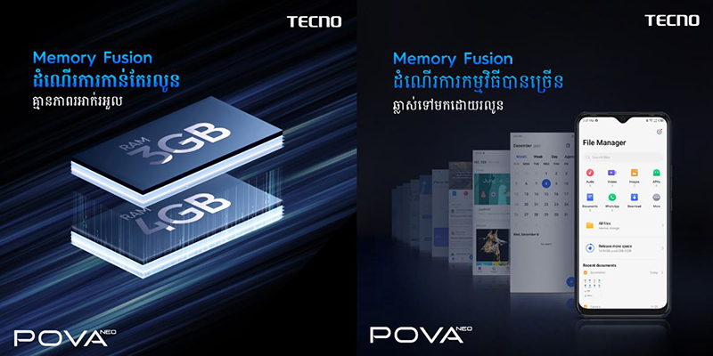ក្រុមហ៊ុន TECNO ដែលជាប្រេនស្មាតហ្វូនកំពុងឡើងកូដ និងជាម៉ាកស្មាតហ្វូនលំដាប់ពិភពលោកដ៏ល្បីល្បាញជំនាន់ថ្មី បានរកឃើញ និងប្រកាសចេញនូវបច្ចេកវិទ្យាថ្មីអស្ចារ្យបំផុតគឺ Memory Fusion ដែលអាចបង្កើនទំហំ RAM ស្មាតហ្វូនរបស់ខ្លួនអោយមានទំហំកាន់តែធំ និងថាមពលខ្លាំងជាងមុនរហូតជិតដល់គុណនឹង២ដងឯណោះ! អ្វីដែលជាដំណឹងល្អនោះ ស្មាតហ្វូន TECNO POVA NEO ដែលកំពុងពេញនិយមដាក់លក់លើទីផ្សារកម្ពុជាយើងក៏នឹងមានបំពាក់នូវបច្ចេកវិទ្យាដ៏អស្ចារ្យនេះផងដែរ!